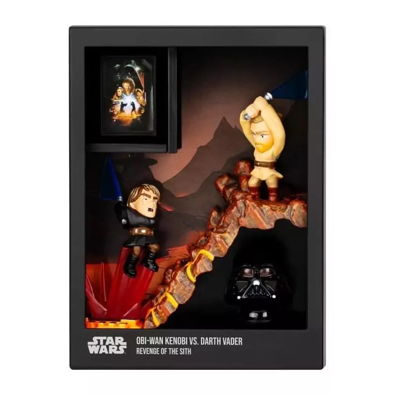 La particularité de cette pièce réside dans sa vitrine avec scène culte qui permet de recréer le duel légendaire qui a opposé les deux Jedi sur la planète Mustafar. De plus, une mini affiche accompagne la figurine, ajoutant une touche de décor authentique à l'ensemble.