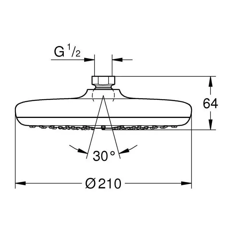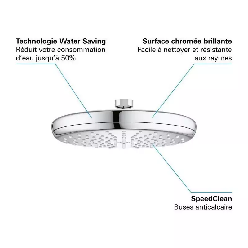 Ce modèle est équipé d'un raccord fileté 1/2, assurant une installation facile et sécurisée. La douche de tête GROHE Vitalio Start 210 - jet unique est non seulement pratique, mais elle apporte également une touche d'élégance à votre salle de bain grâce à son design moderne et épuré.