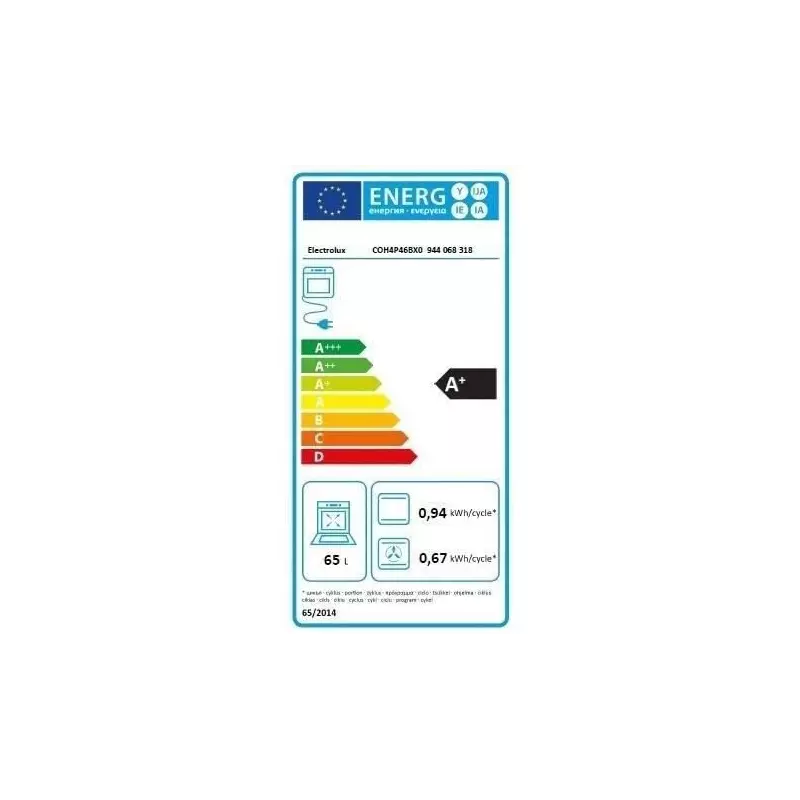Electrolux Serie 600 COH4P46BX0. Taille du four: Moyenne, Type de four: Four électrique, La capacité totale de l'intérieur du four (s): 65 L. Placement de l'appareil: Intégré, Couleur du produit: Acier inoxydable, Type de commande: Rotatif, Tactile. Consommation d'énergie (conventionnelle): 0,94 kWh, Consommation d'énergie (convection forcée): 0,67 kWh, Plage d’efficacité énergétique: A+++ à D. Type de lampe: Halogène, Puissance de l'ampoule: 40 W. Largeur de compartiment d'installation: 56 cm, Profondeur de compartiment d'installation: 55 cm, Hauteur de compartiment d'installation: 59 cm