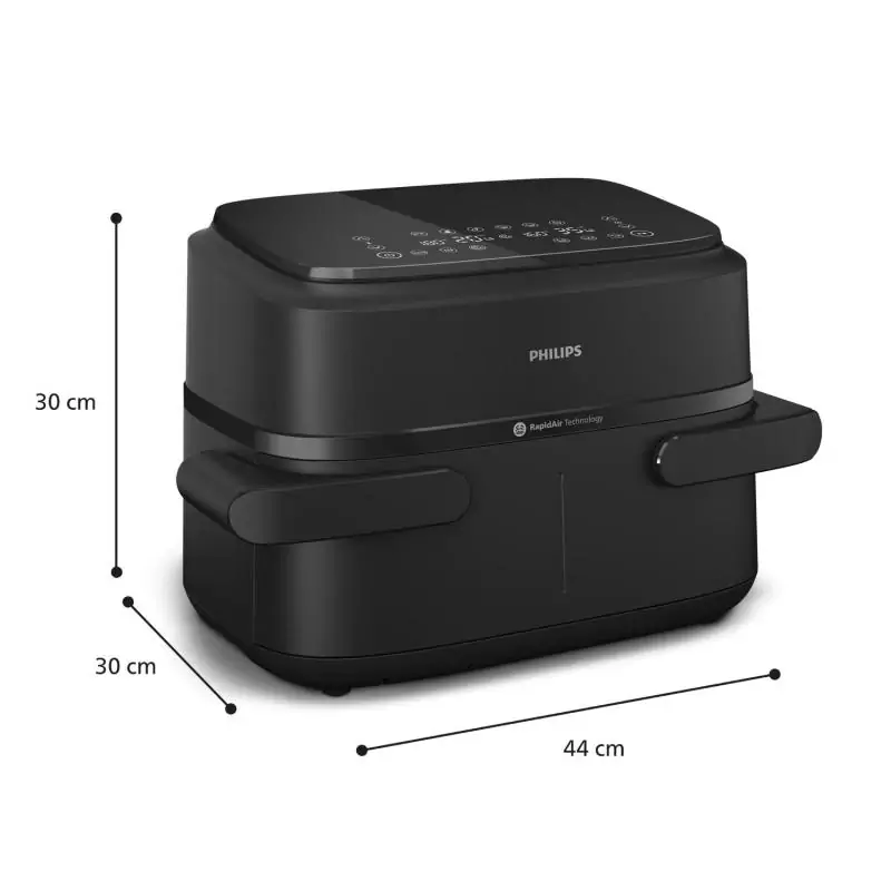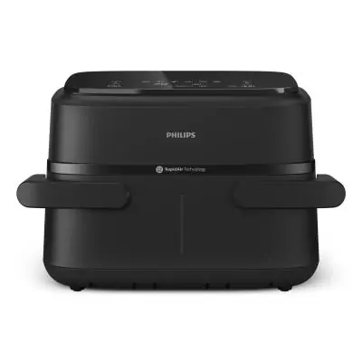 Notre airfryer à double panier le plus compact Passez facilement de deux paniers à un grand plat unique grâce au séparateur amovible. Cuisez toutes sortes de préparations, du repas à deux ingrédients au rôti généreux, avec un résultat toujours tendre et croustillant grâce à la technologie RapidAir.