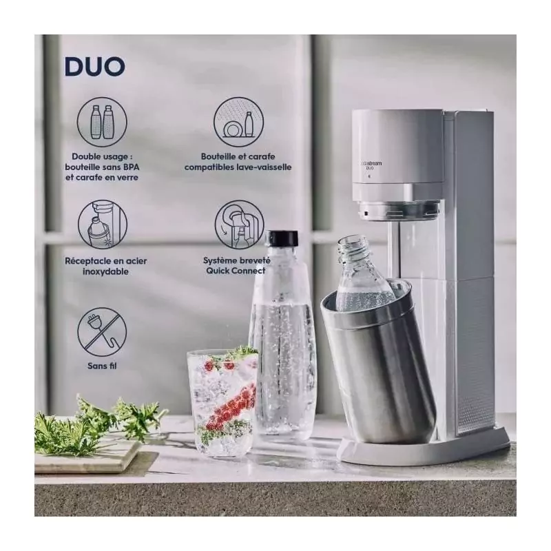 Machine a soda et eau pétillante SODASTREAM - DUO Blanche - 2 carafes en verre - 2 bouteilles - 1 recharge de gaz 60L