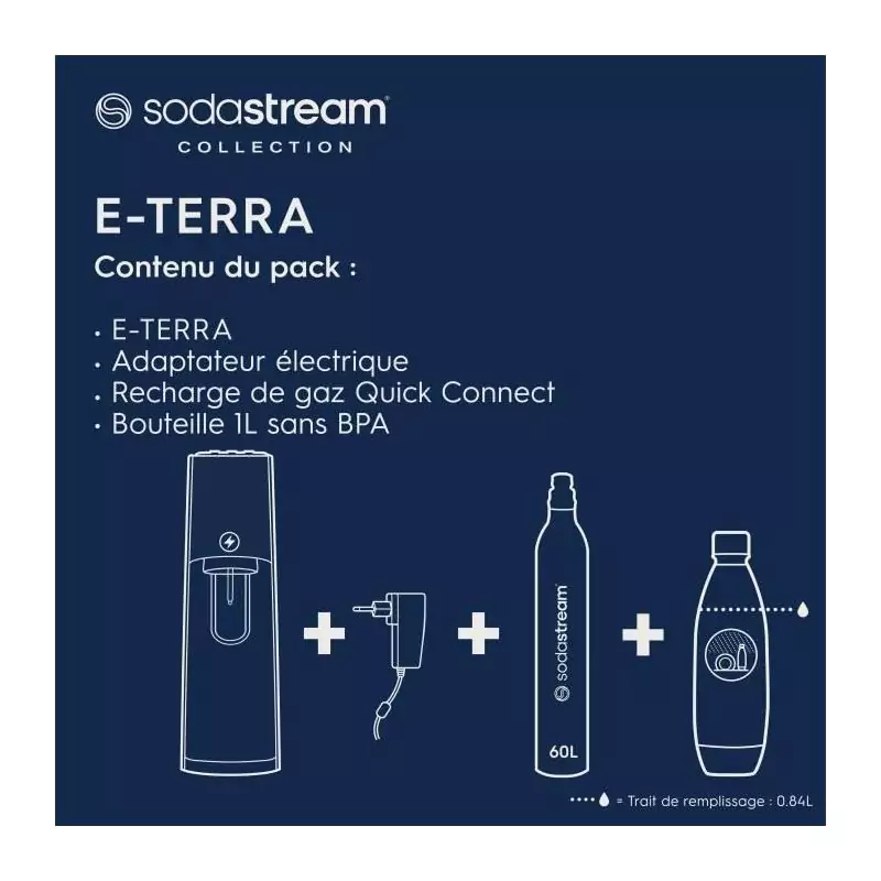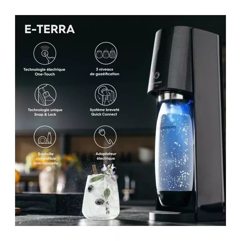 Machine a soda et eau pétillante - SODASTREAM - E-TERRA - 1 bouteille compatible lave-vaisselle - 1 recharge de gaz 60L - Noir
