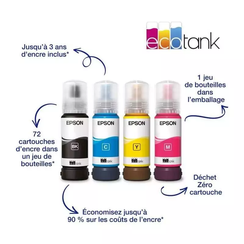 L'un des principaux avantages de cette imprimante est son système de réservoirs d'encre rechargeables. Fini les cartouches coûteuses et peu écologiques ! Avec l'Ecotank ET-2870, vous pouvez imprimer jusqu'à 14 000 pages en noir et blanc et 5 200 pages en couleur avec les bouteilles d'encre incluses, offrant ainsi des économies substantielles à long terme.
