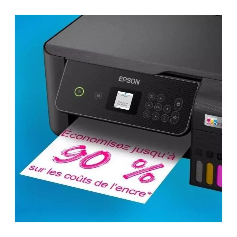 Découvrez l'imprimante multifonction A4 EPSON Ecotank ET-2870 avec Wi-Fi et réservoirs d'encre. Ne vous inquiétez plus des cartouches, car elle inclut 3 ans d'encre ! Facile à utiliser et à connecter à vos appareils, cette imprimante garantit des impressions de haute qualité pour tous vos besoins domestiques ou professionnels. N'attendez plus pour profiter de cette solution d'impression pratique et éco-responsable. Imprimez en toute liberté avec l'Ecotank ET-2870 d'EPSON.