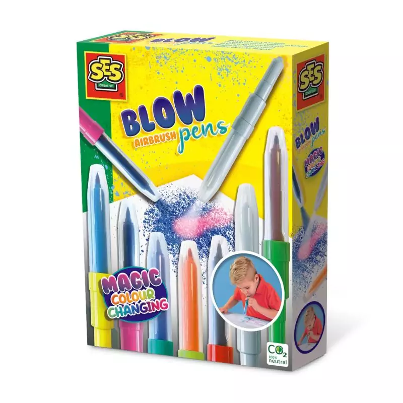 SES Creative Blow airbrush pens - Changement de couleur magique. Type de produit: Kit de moulage/peinture pour enfants, Age recommandé (min): 5 an(s), Matériel: Carton. Contenu de l'emballage: Feutre aérographe à souffler à couleurs changeantes bleu clair/jaune ; Feutre aérographe à.... Type d'emballage: Boîte