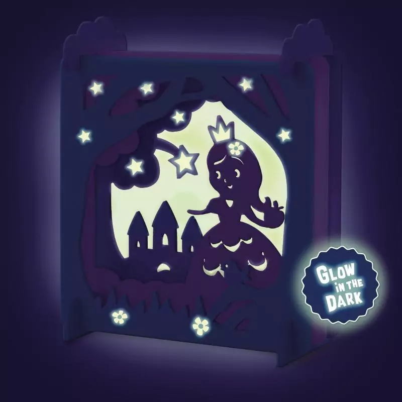 Une belle boîte à ombre à réaliser et à décorer soi-même. Ce monde de princesse se compose de différentes couches qui peuvent être peintes selon votre propre créativité. En collant les autocollants qui brillent dans le noir sur et derrière les calques, vous obtenez une boîte d'ombre brillante unique qui est belle dans la lumière et dans l'obscurité.