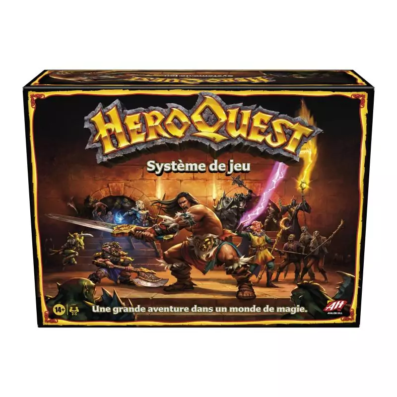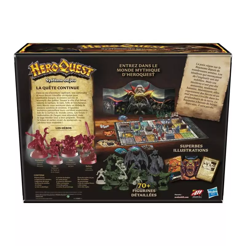 Dans le jeu de plateau d'exploration de donjon HeroQuest, les héros travaillent en équipe pour accomplir des quêtes épiques, trouver des trésors et combattre les forces du mal. C'est un jeu semi-coopératif où l'un des joueurs doit jouer le rôle de Zargon, le maître de jeu, et les autres jouent le rôle de 4 héros mythiques : le barbare, le nain, l'elfe et l'enchanteur. Ces héros doivent travailler en équipe pour venir à bout de labyrinthes et de sombres donjons remplis de monstres. Les joueurs vont pouvoir s'immerger dans une aventure fantastique grâce aux superbes illustrations et aux figurines détaillées (plus de 65). Le jeu inclut 14 quêtes et une rejouabilité presqu'infinie car les joueurs peuvent créer leurs propres quêtes et leurs propres histoires. Il suffit de réunir quelques amis et on est prêt à passer une merveilleuse soirée à combattre le mal ! Pour 2 à 5 joueurs. À partir de 14 ans.