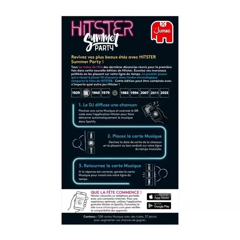 Plongez dans l'univers coloré et festif de Hitster Summer, où l'objectif est de relever des défis drôles et décalés tout en jonglant avec des cartes aux consignes loufoques. L'ambiance est garantie grâce à des épreuves amusantes qui mettront vos talents à l'épreuve et feront ressortir votre créativité.