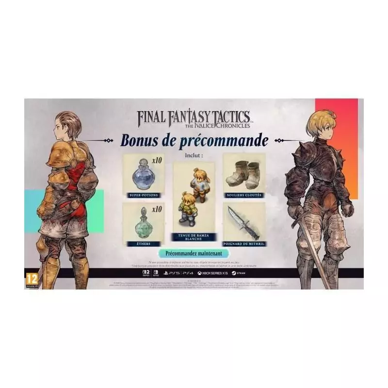 Plongez dans un univers fantastique et stratégique avec FINAL FANTASY TACTICS – The Ivalice Chronicles pour la Nintendo Switch. Ce jeu captivant vous transporte dans le royaume d'Ivalice, où vous devez former votre propre équipe de guerriers et mages pour affronter des ennemis redoutables.