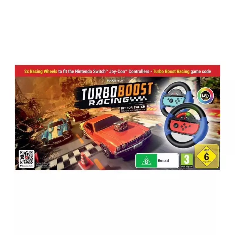 Préparez-vous à vivre une expérience de course ultime avec le Turbo Booster Racing Kit pour la Nintendo Switch. Ce kit comprend à la fois des volants ergonomiques et un jeu palpitant, le tout dans un format "Code in a Box" pratique.