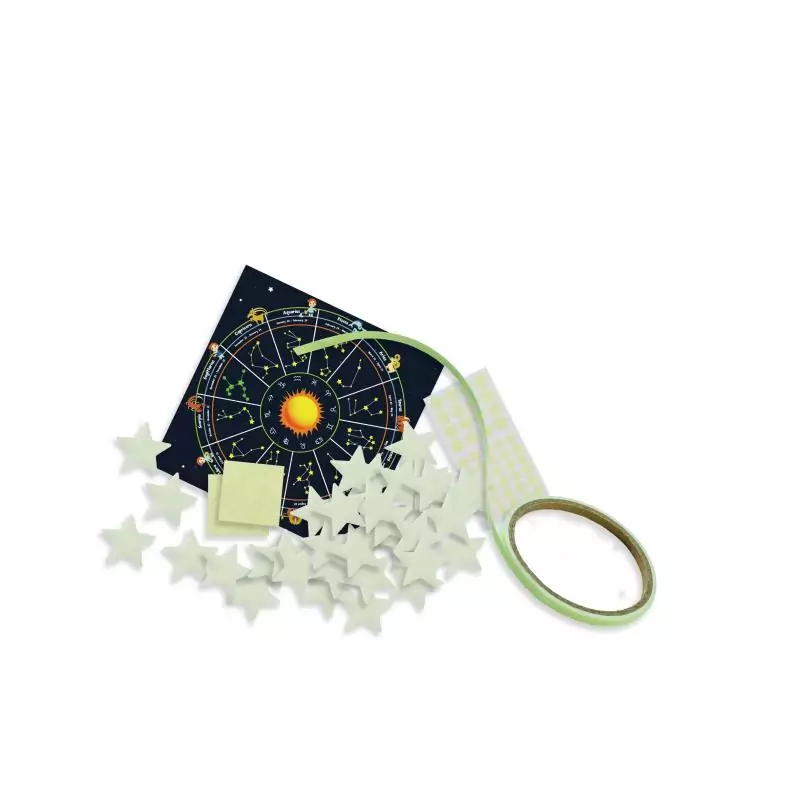 Ce kit contient différents autocollants en forme d’étoile et du ruban adhésif phosphorescent à fixer au mur. Suis les instructions pour réaliser facilement les douze constellations correspondant aux signes du zodiaque.