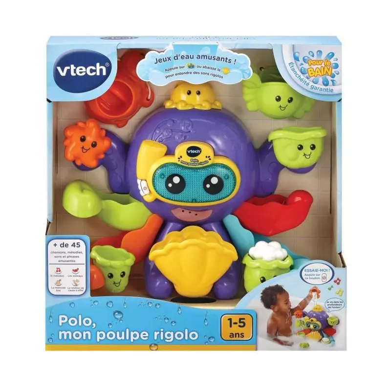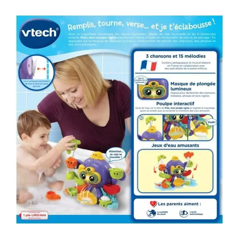 VTech Baby POLO, MON POULPE RIGOLO. Type de produit: Animal de bain, Genre recommandé: Garçon/Fille, Age recommandé (min): 1 an(s), Age recommandé (max): 5 an(s). Batteries requises, Type de batterie: AAA. Matériel: Plastique, Couleur du produit: Multicolore