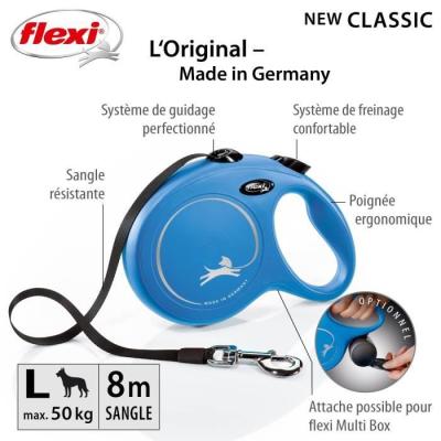 La Laisse New Classic L Tape 8 m blue Flexi CL30T8-251-BL-20 est un accessoire incontournable pour les propriétaires de chiens soucieux de la qualité et du confort de leur animal de compagnie. Avec une longueur de 8 mètres, cette laisse offre à votre chien la liberté de se déplacer tout en restant sous votre contrôle.