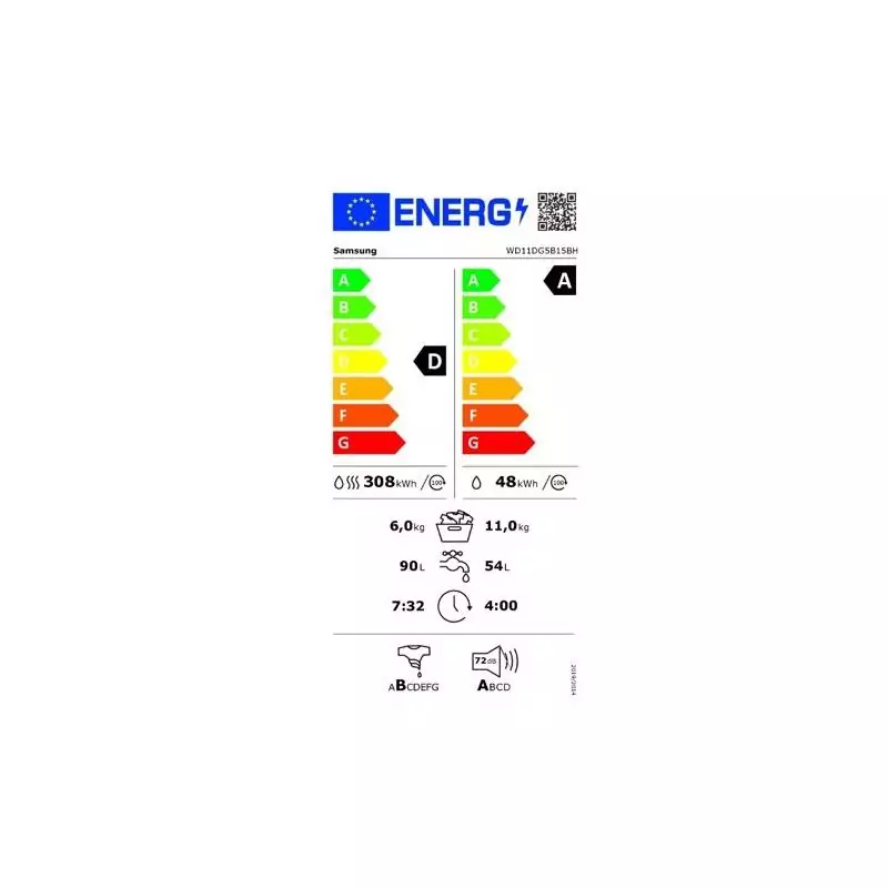 Samsung Lave-linge séchant AI ecobubble™ 11+6kg - WD11DG5B15BH. Type de chargement: Charge avant, Placement de l'appareil: Pose libre, Couleur du produit: Blanc. Capacité nominale (lavage et séchage): 6 kg, Vitesse d'essorage maximale: 1400 tr/min, Classe d'efficacité d'essorage: B. Classe d'efficacité énergétique (lavage): A, Classe d'efficacité énergétique (lavage et séchage): D, Consommation d'eau de lavage: 54 L. Technologies Samsung (soins du linge): SmartThings, ecobubble™. Profondeur: 600 mm, Largeur: 600 mm, Hauteur: 850 mm
