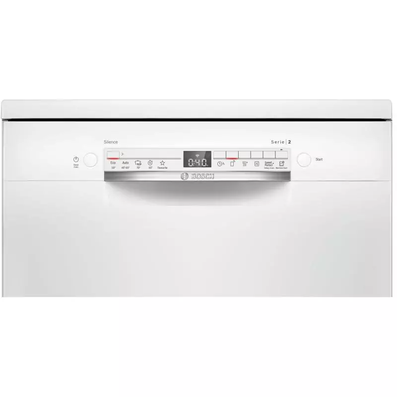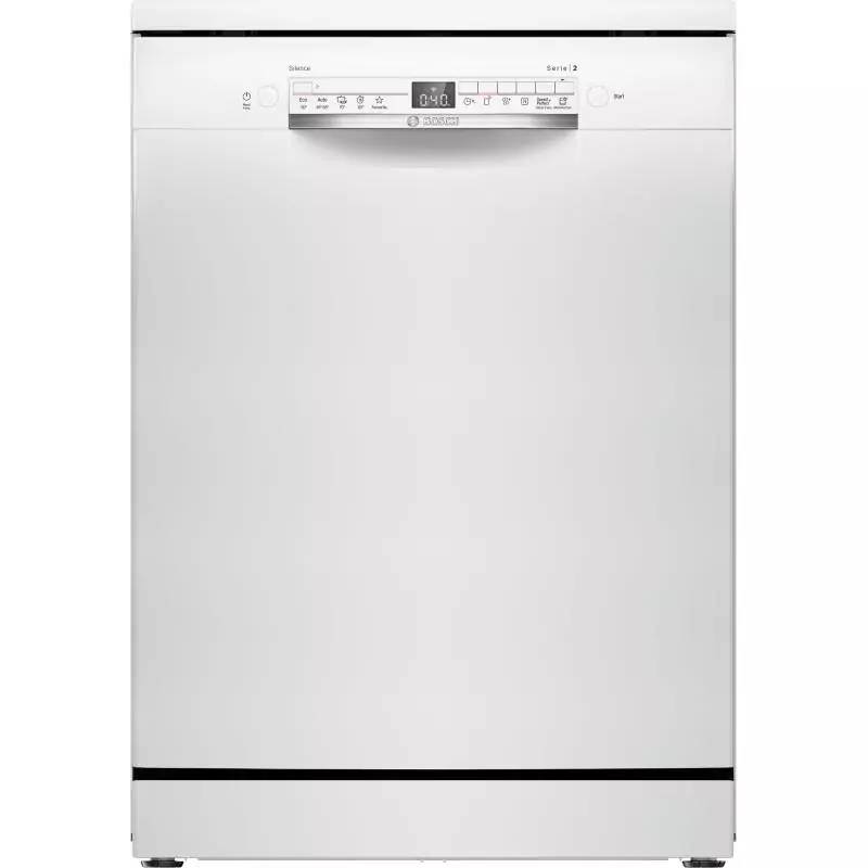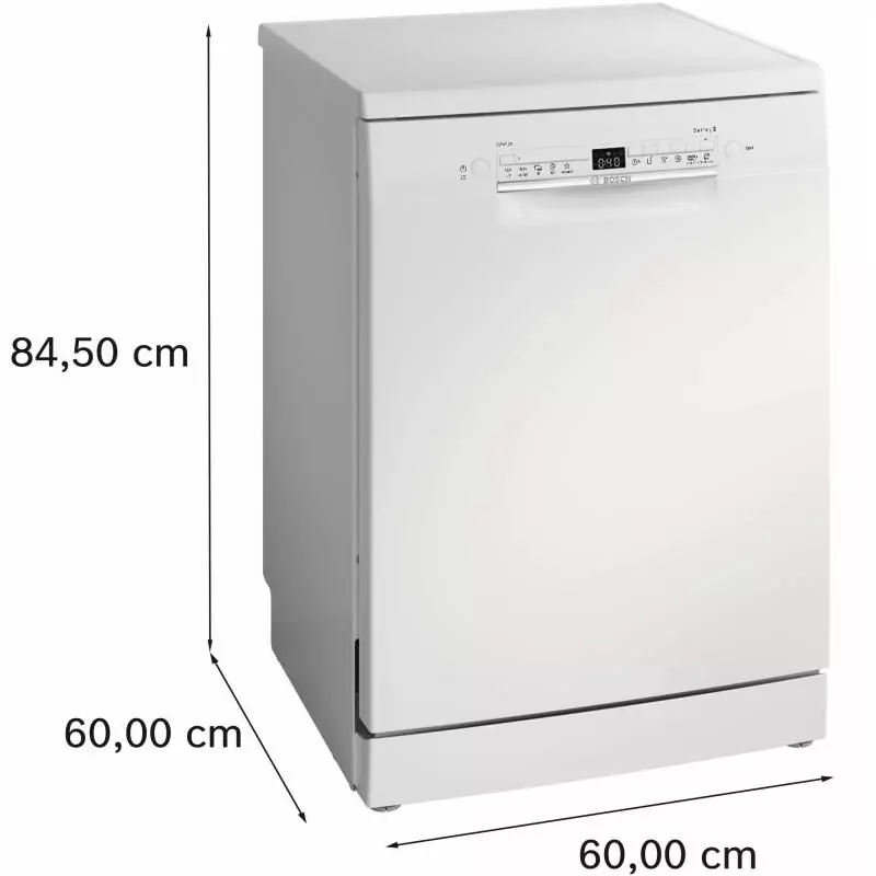 Bosch Serie 2 SMS2HTW02E. Placement de l'appareil: Pose libre, Taille du produit: Taille maximum (60 cm), Couleur de la porte: Blanc. Nombre de couverts: 14 couverts, Classe d'émission sonore: C, Niveau sonore: 46 dB. Réglage des pieds: 2 cm, Apps de contrôle prises en charge: Bosch Home Connect. Classe d'efficacité énergétique: D, Consommation d'eau par cycle: 9 L, Consommation d'énergie pour 100 cycles: 84 kWh. Largeur: 600 mm, Profondeur: 600 mm, Hauteur: 845 mm