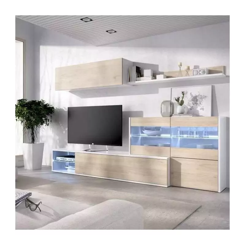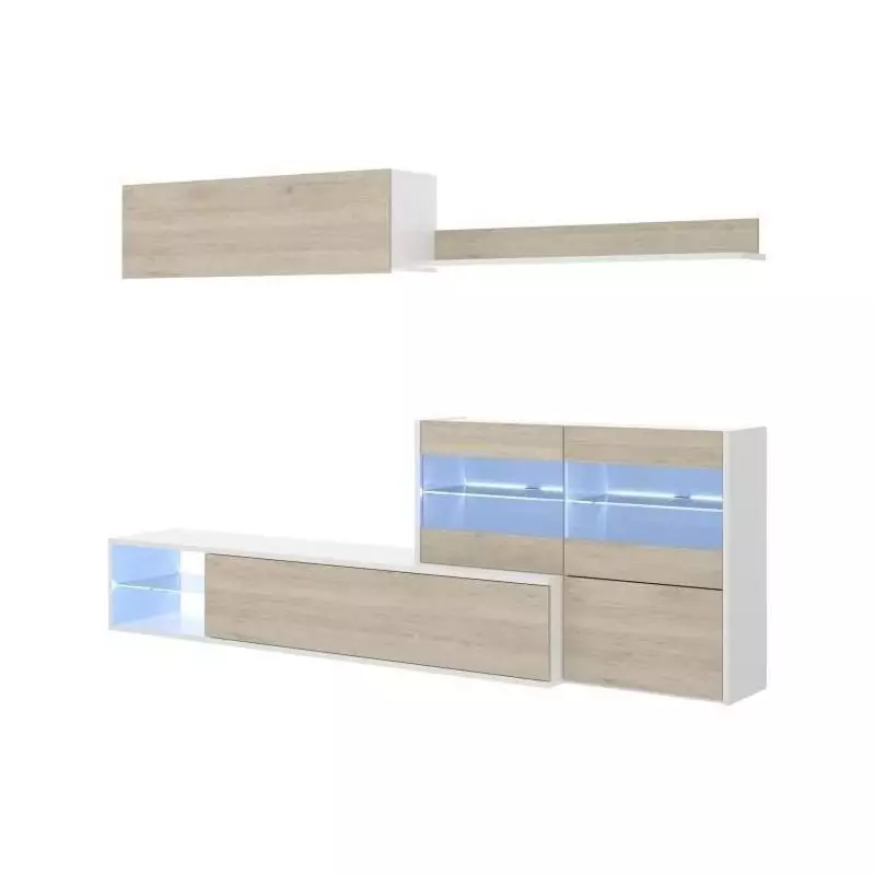 Ensemble meuble séjour living avec vitrine LED - Décor chene et blanc - L 260 x P 41 x H 180 cm - UMA