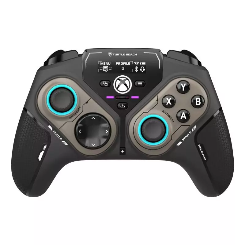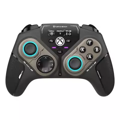 La manette intelligente sans fil Turtle Beach Stealth™ Pivot a été conçue pour révolutionner l'expérience de jeu sur PC Windows. Elle apporte un degré de personnalisation encore plus poussé pour les joueurs, peu importe le style de jeu. La Stealth™ Pivot comprend des modules pivotants à boutons pour changer rapidement de configuration. Les commandes principales de la manette comprennent la croix directionnelle et un stick sur le module de gauche, ainsi que les boutons ABXY et un autre stick sur le module de droite ; une configuration classique, mais idéale pour les sports traditionnels, les FPS, les jeux d'action et de course. La configuration pivotante avec boutons comprend une croix directionnelle, ainsi que les boutons RSB et LSB sur le module de gauche, les boutons ABXY et des boutons assignables P1 et P2 sur le module de droite ; une configuration parfaite pour les jeux de combat et les jeux rétro. Faites glisser les interrupteurs de déverrouillage à l'arrière de la manette, puis faites pivoter les modules, indépendamment ou simultanément, avant de refaire glisser les interrupteurs en place pour verrouiller la nouvelle configuration. Grâce à l'émetteur USB sans fil ni lags, vous pouvez vous connecter rapidement et en toute confiance sur votre PC Windows et profiter d'une autonomie allant jusqu'à 20 heures. De plus, la connectivité Bluetooth® intégrée vous permet également de connecter votre manette Stealth™ Pivot à vos appareils Android, ainsi qu'aux Smart TV Samsung. Pour une compatibilité encore plus étendue, le câble inclus vous permet de jouer en filaire sur consoles Xbox Series X|S et Xbox One, ou jouer tout en rechargeant votre manette sur PC. Les sticks Anti-Drift™ à effet Hall vous permettent de profiter de commandes fluides durables, sans dérive. Vous pouvez même régler les performances des sticks en fonction du jeu auquel vous jouez. Par exemple, utilisez des contrôles linéaires pour une conduite cohérente dans les jeux de course ou des contrôles de précision pour une visée précise dans les jeux d'action et les jeux FPS. Les deux boutons assignables à l'arrière de la manette sont toujours faciles d'accès et le mode de ciblage Pro-Aim™ est une fonction assignable prédéfinie conçue pour réduire la sensibilité du stick afin d'améliorer la précision de la visée dans les FPS. Des boutons assignables supplémentaires sont disponibles sur les configurations pivotantes des principaux modules de contrôle. Modifiez à la volée la distance de déplacement des gâchettes selon vos besoins : plus courtes pour des retours plus rapides dans les jeux FPS, ou complètes pour un contrôle précis dans les jeux de course. Le Connected Command Display à contraste élevé offre un large panel de fonctions de personnalisation ainsi que l'affichage des notifications de vos réseaux sociaux pour garder le contact avec vos amis. Depuis cet écran, vous pouvez consulter vos notifications de réseaux sociaux, ajuster les paramètres audio de n'importe quel casque connecté en 3,5 mm, assigner les entrées des boutons programmables, de la croix directionnelle et des curseurs, ainsi que gérer à la volée vos connexions sans fil et Bluetooth®. Situé sous l'écran, l'interrupteur à bascule de réglage Quick-Slide vous permet de procéder rapidement à des ajustements en jeu qui peuvent être assignés à des fonctions différentes comme l'équilibrage du volume du jeu et du chat ou de personnaliser son éclairage RGB. La batterie dispose de 20 heures d'autonomie et se charge rapidement, ainsi vous pouvez rester concentré sur vos parties sans interruption. De plus, le câble USB-C fourni vous permettra de continuer à jouer en rechargeant la batterie lorsque celle-ci sera à plat. Pour profiter d'options de personnalisation supplémentaires et procéder à des mises à jour rapides du produit, téléchargez l'application Control Center 2 pour PC, consoles Xbox et appareils iOS et Android. L'application permet de définir les notifications de réseaux sociaux, la personnalisation des boutons, les zones mortes, les modes de réponse des axes, l'intensité des vibrations, les améliorations audio et l'éclairage RGB.