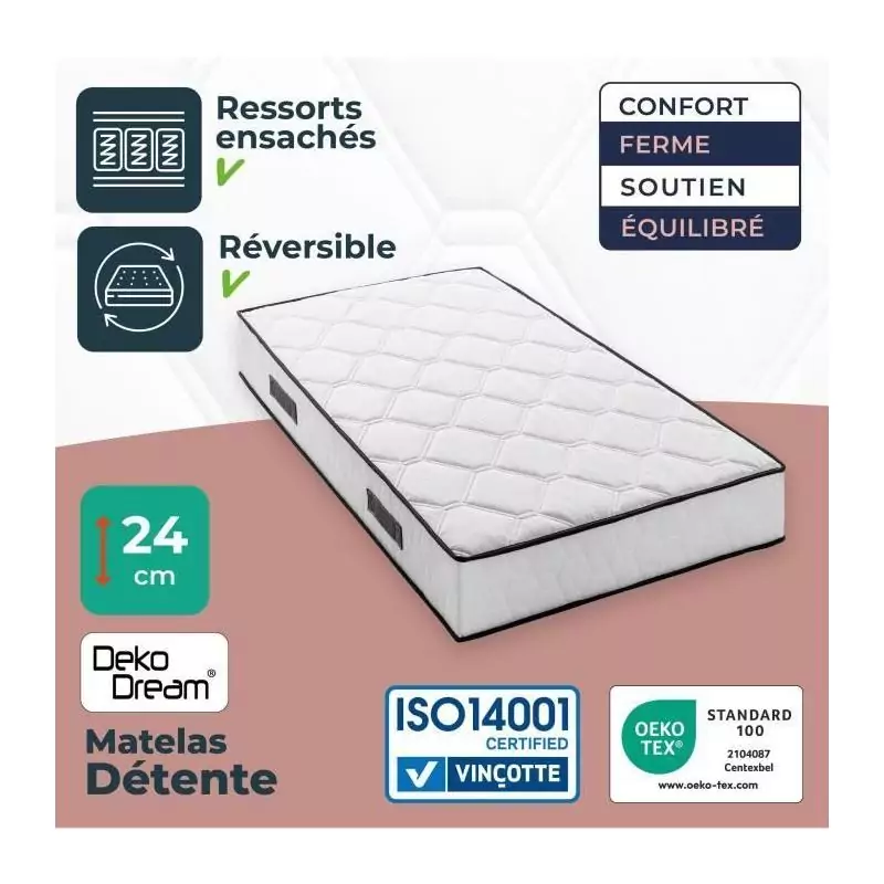 Le Matelas 90 x 200 cm est un produit de qualité supérieure pour assurer un sommeil confortable et réparateur. Avec une hauteur de 24 cm et 380 ressorts ensachés, ce matelas offre un soutien optimal à chaque zone de votre corps.
