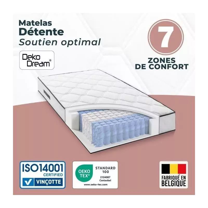 Offrez-vous des nuits paisibles et revitalisantes avec le Matelas 90 x 200 cm - Hauteur 24 cm - 380 ressorts ensachés - 7 zones - Equilibré - réversible - fabriqué en Belgique.
