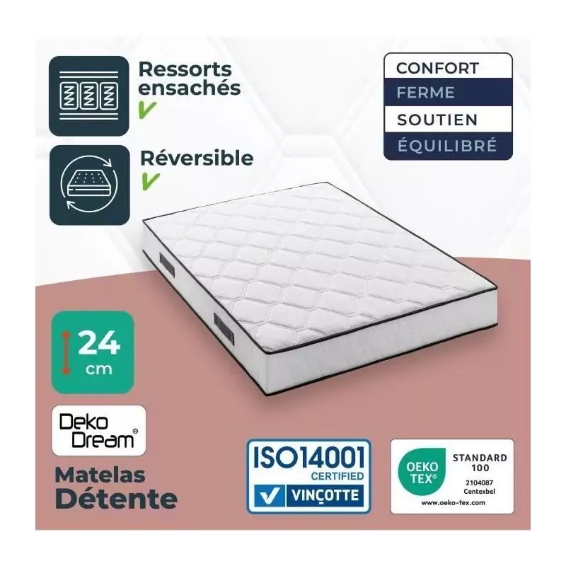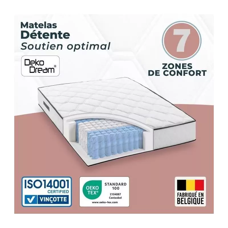 Matelas 160 x 200 cm - Hauteur 24 cm - 770 ressorts ensachés - 7 zones - Equilibré - réversible - fabriqué en Belgique - DEK