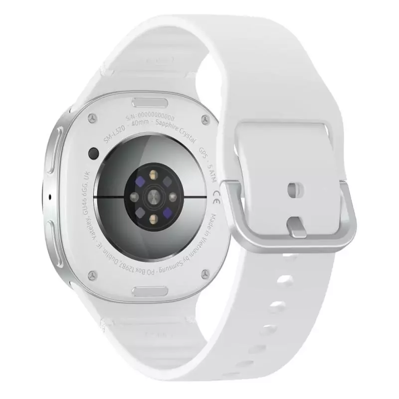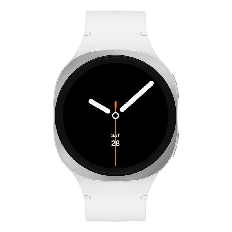 Samsung Galaxy Watch8 Bluetooth (40 mm). Taille de l'écran: 3,3 cm (1.3"), Technologie d'affichage: AMOLED, Résolution de l'écran: 438 x 438 pixels. Fréquence du processeur: 1,6 MHz, Capacité de la RAM: 2 Mo, Memoire flash: 32 Go. Wifi. GPS (satellite). Capacité de la batterie: 325 mAh. Poids: 30 g. Couleur du bracelet: Blanc, Taille du bracelet: S/M. Système d'exploitation installé: Wear OS