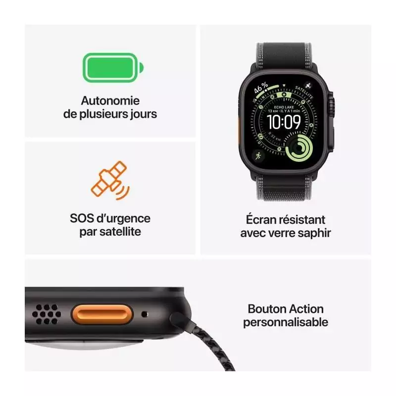 L’Apple Watch Ultra 3 GPS + Cellular est une montre intelligente de qualité supérieure qui allie élégance et technologie de pointe. Avec son boîtier en titane naturel et son bracelet bleu clair Alpine Loop, elle offre un design raffiné et un confort optimal pour une utilisation quotidienne.