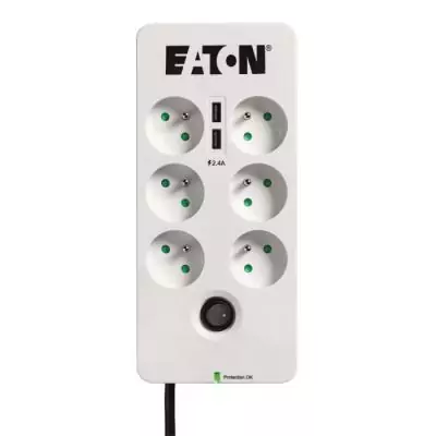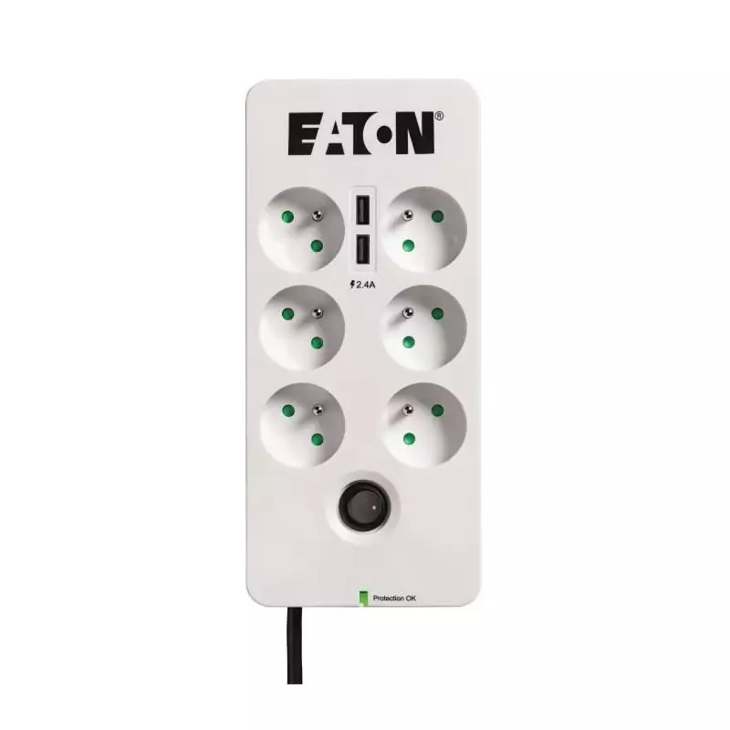 Multiprise/Parafoudre - EATON Protection Box 6 Tel USB FR - PB6TUF - 6 prises FR + 1 prise tel/RJ + 2 ports USB - Blanc & Noir