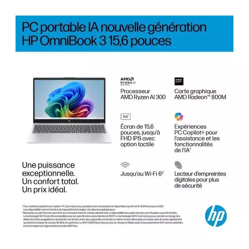 PC Portable HP Omnibook 3 15-fn0021nf - Windows 11 - 15,6 FHD IPS - Ryzen AI 5 340 - RAM 24Go - Stockage 512Go SSD - AZERTY
