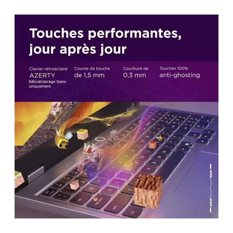 Que vous soyez un joueur passionné ou un professionnel à la recherche d'un ordinateur portable performant, le LENOVO LOQ 15IRX10 répondra à tous vos besoins en matière de gaming. Grâce à son clavier AZERTY confortable et réactif, chaque action est précise et rapide, vous permettant de rester concentré sur votre jeu.