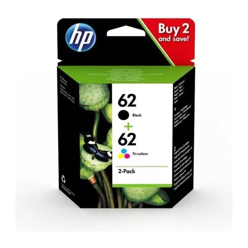 HP 62 pack de 2 cartouches authentiques d'encre noire / trois couleurs. Type d’encre de couleur: Encre à colorant, Type de cartouche d'encre: Rendement standard, Type d’encre noire: Encre à pigments, Type d'alimentation: Multi pack, Rendement par page d'encre de couleur: 165 pages, Couleurs d'impression: Noir, Cyan, Magenta, Jaune, Quantité: 2 pièce(s), Rendement par page de l'encre noire: 200 pages