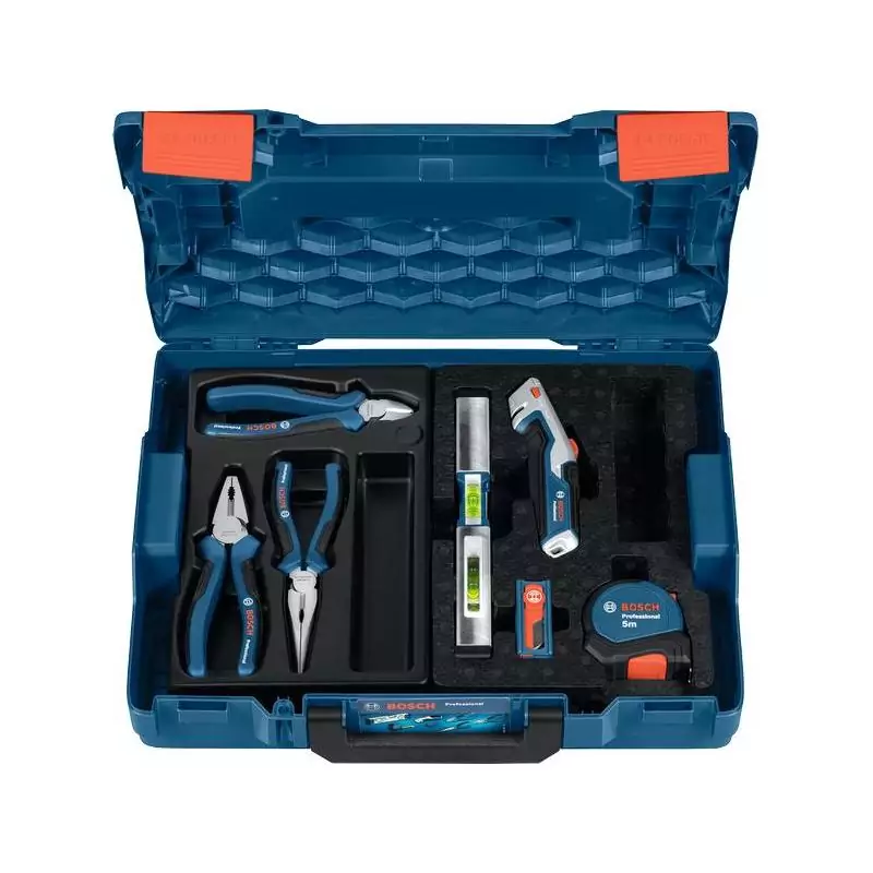 Informations complémentaires Contenu du set : pince droite à becs longs (200 mm), pince universelle (180 mm), pince coupante diagonale (160 mm), niveau à bulles aimanté de 25 cm, mètre ruban de 5 m, cutter à moquette à lame rétractable avec 10 lames de rechange. Les 2 demi-calages inclus sont optimisés pour le coffret L-BOXX 102 de Bosch Professional.