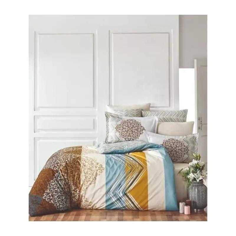 Voici une magnifique parure de lit qui va transformer votre chambre en un véritable havre de paix. Cette parure comprend une housse de couette de dimensions généreuses 220 x 240 cm, ainsi que deux taies d'oreiller assorties de 60 x 60 cm. Fabriquée à partir de 100% coton renforcé, cette parure est à la fois douce, confortable et durable.
