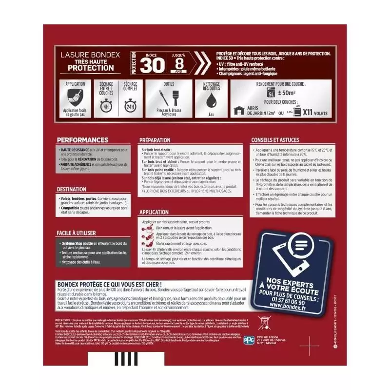 Les caractéristiques clés de la BONDEX Lasure lasure ind 30 / 8 ans 5l incluent :