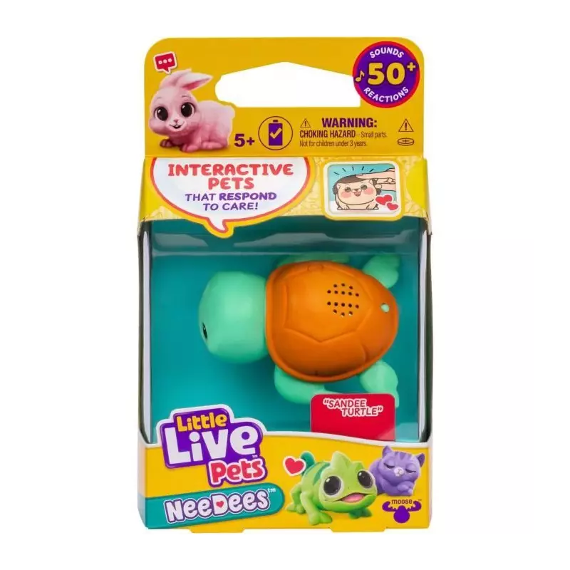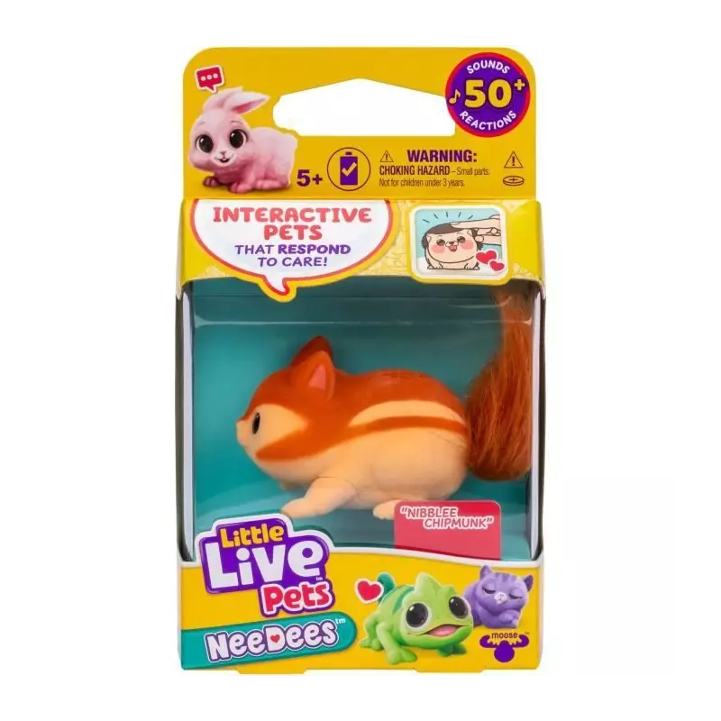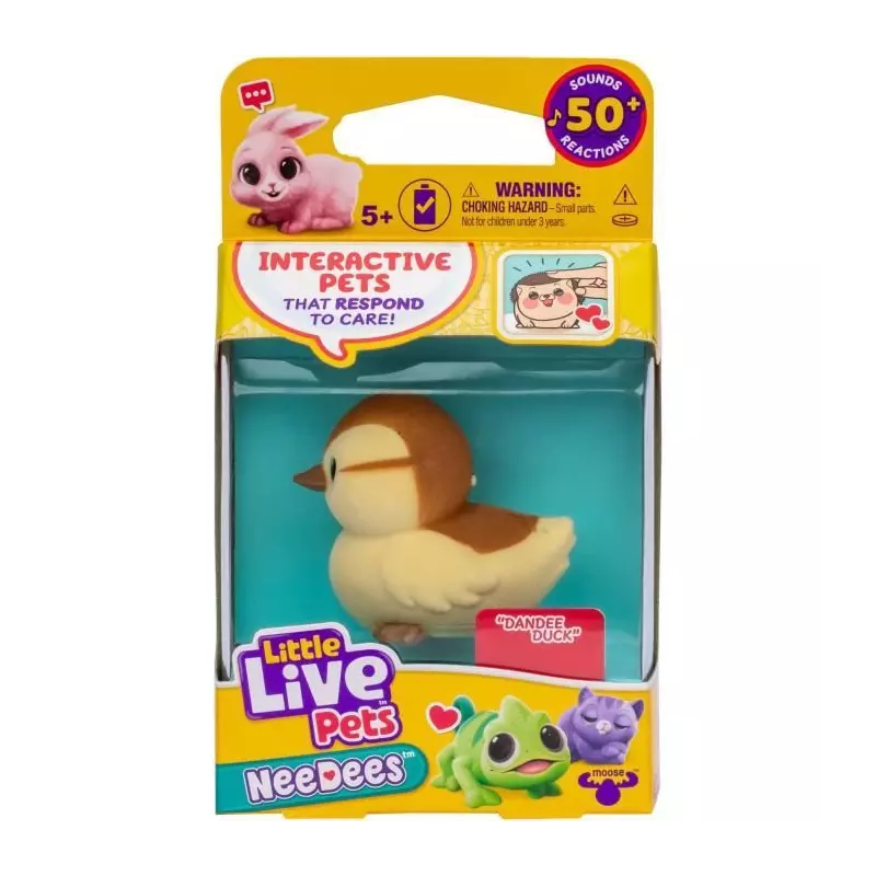 Dites bonjour à Little Live Pets NeeDees ! Les animaux de compagnie interactifs et portables qui répondent aux besoins de votre enfant. Écoutez leurs besoins, répondez à temps et marquez des points NeeDee ! Avec plus de 50 sons et réactions. Collectionnez les 13 Needees. Animal de compagnie portable Le design innovant de NeeDees permet une fixation facile aux vêtements, afin que votre enfant puisse transporter et porter son animal de compagnie interactif préféré partout où il va. NeeDees est le compagnon idéal, prêt à partager chaque aventure. Plus vous vous en souciez, plus votre score est élevé Répondez à chaque appel de NeeDee et gagnez des points, transformant chaque acte de soin en un jeu enrichissant. Les appels manqués diminuent leur score, tandis que les réponses rapides l'augmentent. Petit et adorable Les NeeDees sont conçus avec une taille compacte qui en fait le compagnon idéal des enfants pour les accrocher à leurs vêtements, faciles à transporter et à utiliser où qu'ils aillent. Plus de 50 sons et réactions Les NeeDees prennent vie grâce à plus de 50 sons et réactions. Leurs yeux clignotants expressifs et leur personnalité unique d'animal de compagnie réagissent de manière dynamique aux soins et aux jeux. Cette interaction vivante entre le son et les yeux expressifs crée un compagnon réaliste dans NeeDees ! Collectionnez-les tous Il y a 13 Needees adorables différents à collectionner au cours de la série 1. Cherchez deux Needees rares - Nibblee Chipmunk et Dandee Duck ou trouverez-vous le Golden Duck en édition limitée - Duckee Duck. Qu'est-ce qui est inclus ? 3 piles LR44 1 x Nécessaire interactif 1 x Manuel d'instructions 1 x Guide de démarrage rapide