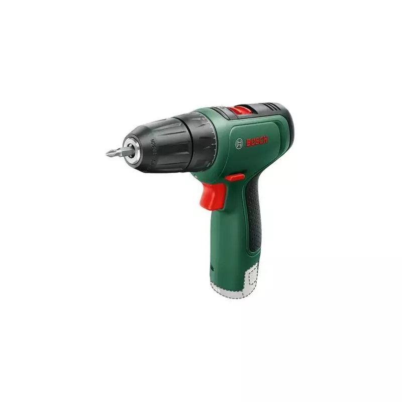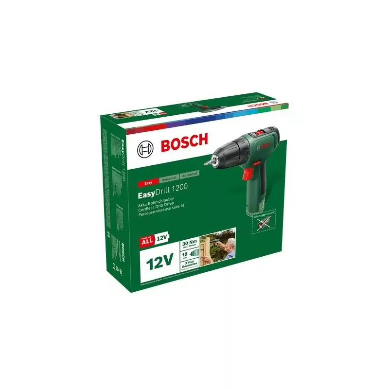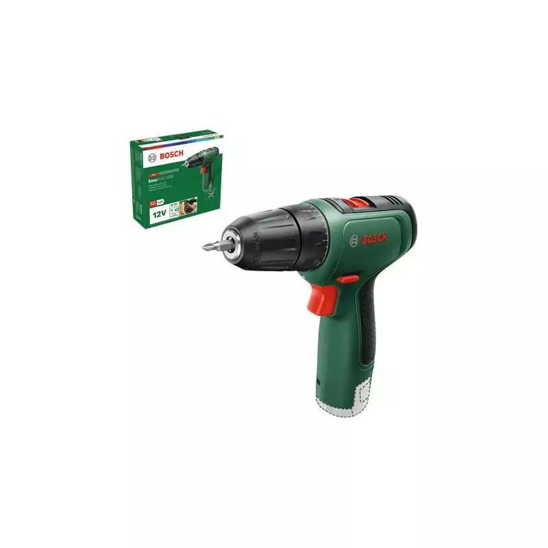 Bosch EasyDrill 1200. Conception du produit: Perceuse à poignée pistolet, Type de mandrin: Sans clé, Type de Moteur: Sans brosse. Capacité du mandrin (max): 1 cm, Vitesse de ralenti (max): 1500 tr/min, Diamètre de perçage dans le bois (max): 2 cm. Source d'alimentation: Batterie, Technologie batterie: Lithium-Ion (Li-Ion), Capacité de la batterie: 1,5 Ah. Poids: 940 g, Largeur: 209 mm, Profondeur: 232 mm