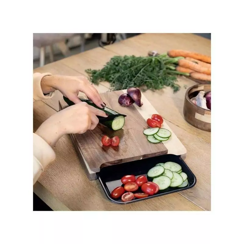 Sa particularité réside dans son bac récupérateur amovible, idéal pour récupérer les jus et les déchets alimentaires tout en gardant votre plan de travail propre. Plus besoin de jongler entre différents ustensiles, tout est regroupé sur cette planche à découper ingénieuse.