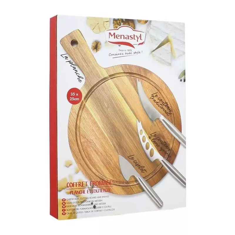 Planche à découper MENASTYL 5040076 en bois d'acacia avec 3 couteaux à fromage en inox