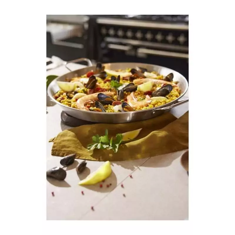 Fabriqué en acier inoxydable, ce plat est non seulement durable, mais aussi facile à nettoyer. Sa poignée robuste assure une manipulation aisée et sécurisée, vous permettant de transporter votre paella du four ou de la cuisinière à la table de manière pratique.
