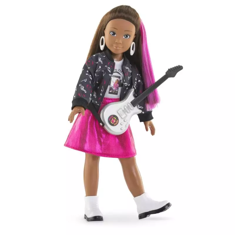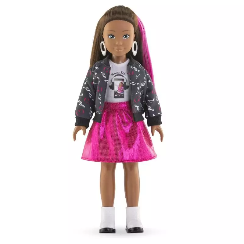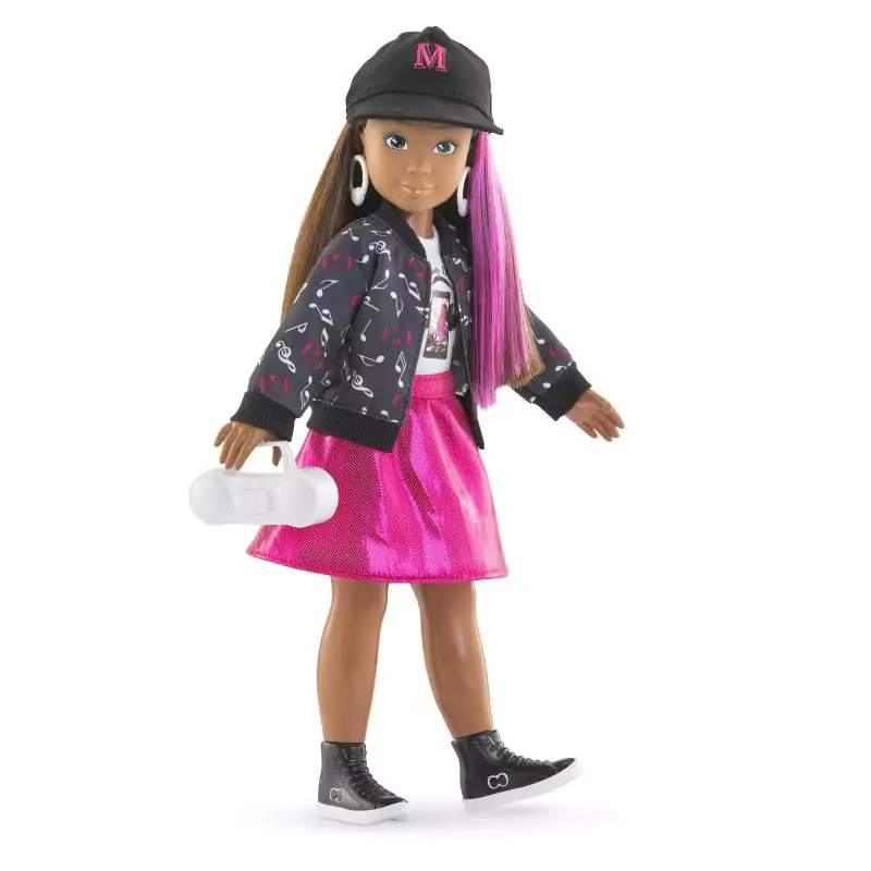 Le coffret Melody Music Studio est composé de Melody, une poupée mannequin de 28 cm, et de 4 accessoires. Melody a un joli visage naturel aux traits fins qui sent bon la vanille. Ses yeux sont peints et elle possède de longs cheveux châtains lumineux avec une mèche rose. Elle porte une jupe, un t-shirt, un blouson, une paire de pieds-bottines amovible et une paire de boucles d'oreilles amovible. Cette mélomane est accompagnée de sa guitare qu'elle ne quitte jamais, toujours prête à jouer un morceau de musique, son poste radio, sa casquette et une paire de pieds-baskets montantes amovibles. Elle a un corps réaliste de jeune adolescente, tient assise et debout toute seule. Les Corolle Girls sont déclinées en 3 modèles et disposent de plusieurs coffrets dressing pour varier les vêtements et les accessoires. Dès 4 ans. Corolle Girls, mes meilleures amies !