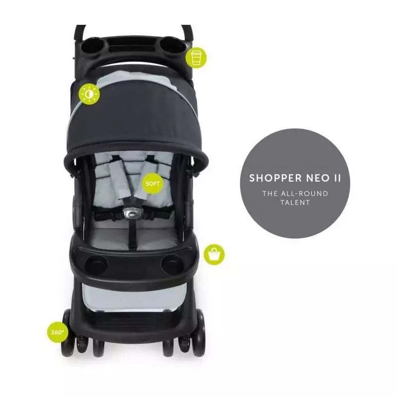 Pour plus de praticité, la poussette SHOPPER NEO II est équipée d'un panier spacieux pour ranger facilement les affaires de bébé et les courses. Les parents apprécieront également la poignée réglable en hauteur, qui s'adapte à toutes les morphologies.
