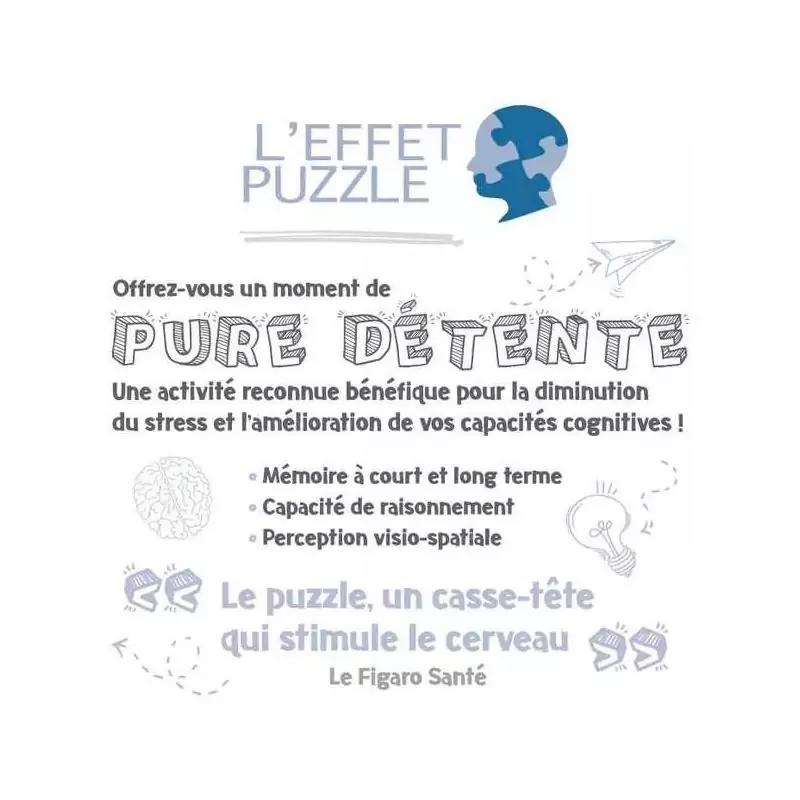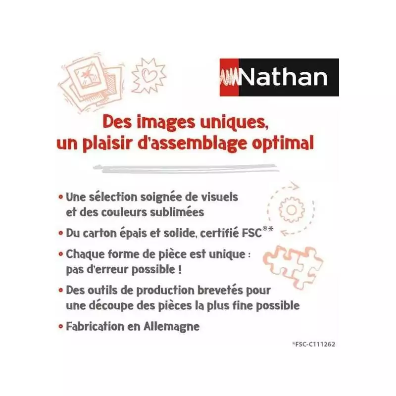 A travers huit collections (Evasion, Urbain, Tendresse, Vie sauvage, Artiste, Nostalgie, Photo d'Art et Mes Héros), Nathan dévoile une sélection raffinée d'images inédites et originales, pour répondre à toutes les envies de puzzle. Forte de son savoir-faire dans le livre, la marque Nathan élabore ses puzzles à partir d'images choisies avec le plus grand soin, pour leur qualité, leur dimension symbolique ou les émotions qu'elles suscitent. Pour les puzzleurs occasionnels et les adolescents, le format 500 pièces est idéal pour profiter de cette activité, propice au calme et à la relaxation.