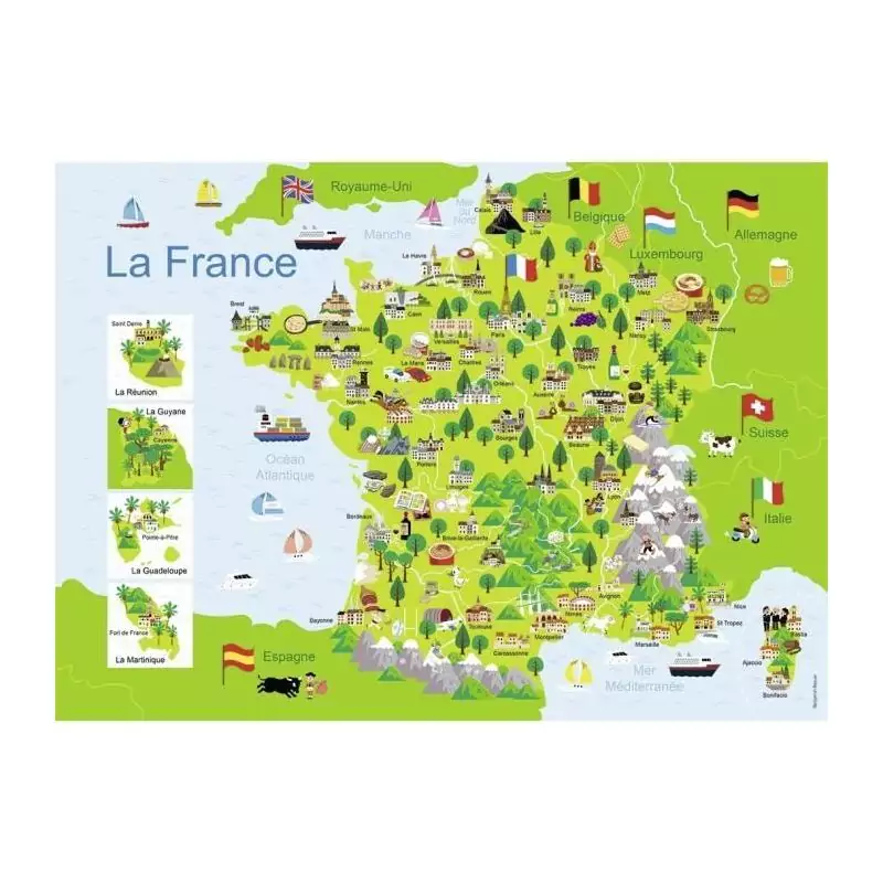 Ce puzzle enfant de 100 pièces est une manière ludique d'apprendre la géographie de la France. Avec la Carte de France comme motif principal, ce puzzle éducatif permet aux enfants de découvrir les régions et départements français tout en s'amusant.