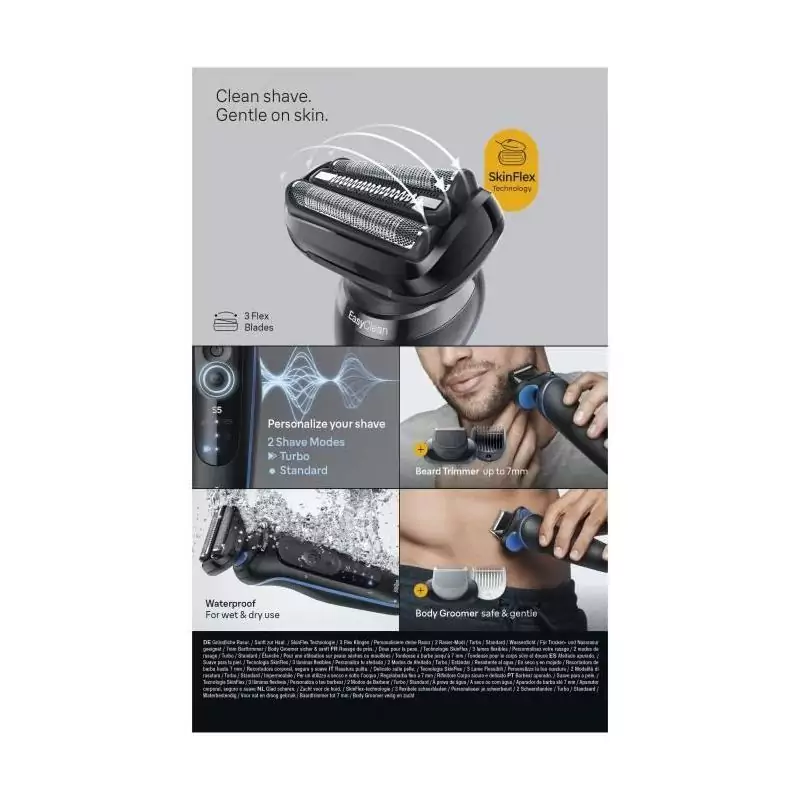 Doté de technologies avancées, le rasoir électrique BRAUN Series 5 garantit un rasage confortable et doux pour la peau. Ses lames tranchantes capturent et coupent efficacement les poils, laissant votre peau lisse et soyeuse. De plus, sa tête flexible s'adapte parfaitement aux contours de votre visage pour un rasage précis et sans effort.