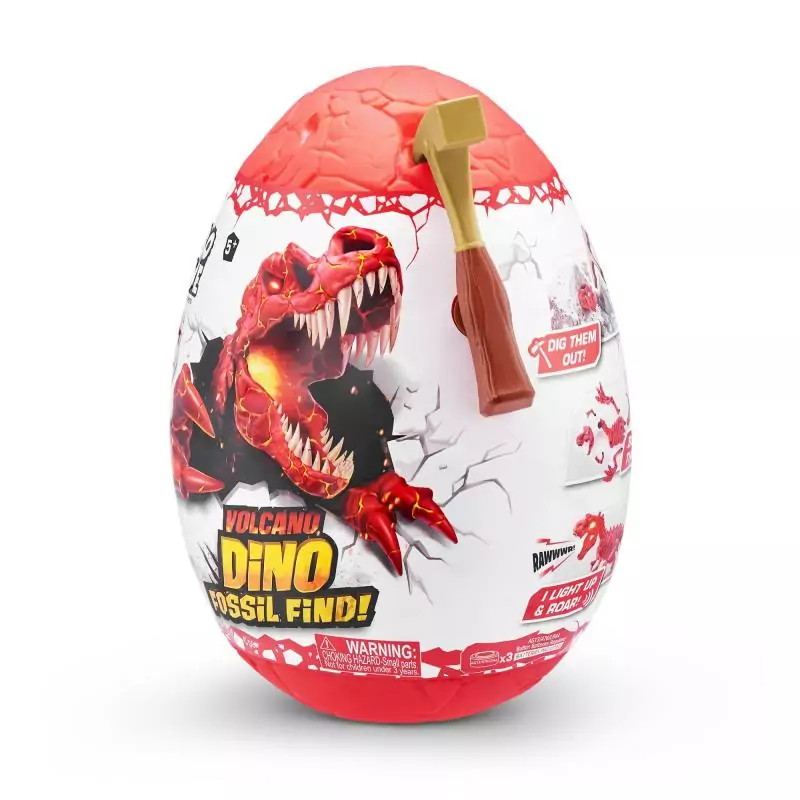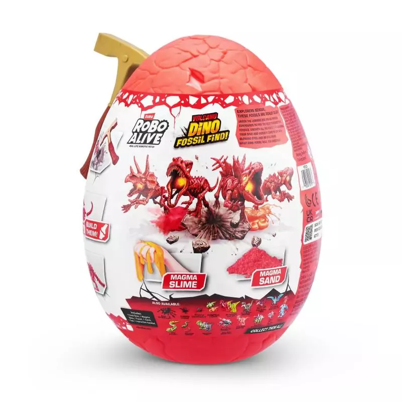 Mets le feu avec Robo Alive Volcano Dino Fossil Find. Fouille dans la roche volcanique, le sable et la vase à l’aide de l’outil d’excavation pour trouver l’un des quatre fossiles de dinosaures magma. As-tu découvert le redoutable T-Rex, le terrifiant triceratops, l'impressionnant ankylosaurus ou l’incroyable stegosaurus? Assemble les pièces fossiles pour donner vie à ton squelette de dinosaure avec son et lumière! Avec un look magma incandescent et un rugissement réaliste de dinosaure, ces fossiles de dinosaures sont du jamais vu. C'est plus que vivant : c'est Robo Alive.