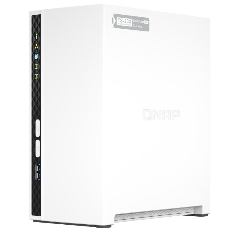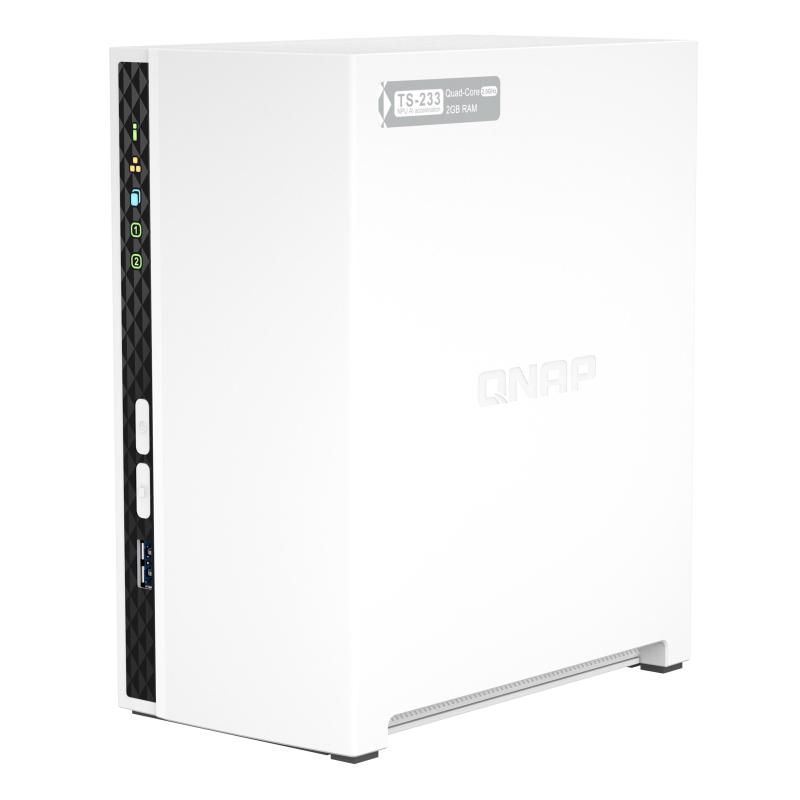 QNAP TS-233. Type: NAS. Type de châssis: Tower. Classe de dispositif: Domicile et télétravail. Famille de processeur: ARM, Modèle de processeur: Cortex-A55, Fréquence du processeur: 2 GHz. Mémoire interne: 2 Go. Capacité totale du stockage installé: 0 To. Système d'exploitation installé: QNAP QTS
