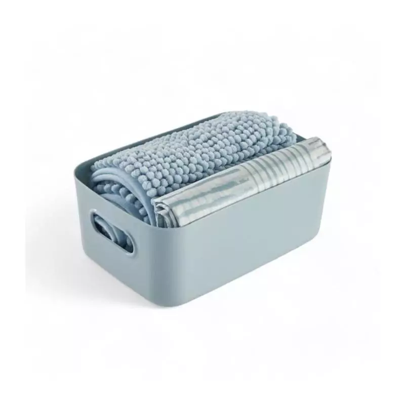Le Set de douche TODAY - UTILITY - Panier, tapis, rideau en bleu est l'ensemble parfait pour rafraîchir votre salle de bain avec style et fonctionnalité. Ce set comprend tout ce dont vous avez besoin pour une expérience de douche complète et agréable.