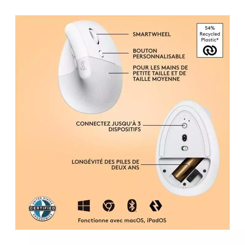 Découvrez la souris sans fil Logitech Lift Ergonomique Verticale, conçue pour offrir un confort optimal à tous les droitiers. Grâce à sa conception ergonomique verticale, cette souris réduit la fatigue et les tensions au niveau du poignet, offrant ainsi une expérience de travail plus agréable et productive.