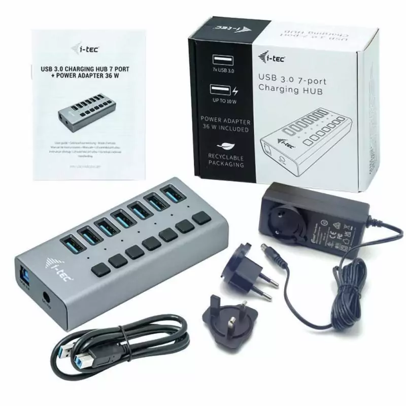 Doté de sept ports USB 3.0, ce hub vous permet de connecter plusieurs périphériques en toute simplicité, offrant des vitesses de transfert ultra-rapides pour une expérience utilisateur fluide et sans accroc. De plus, avec son adaptateur secteur 36 W, vous pouvez recharger rapidement vos appareils tout en utilisant le hub.