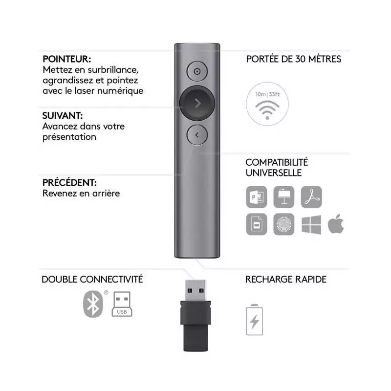 Pointeur - Logitech - Spotlight - Compatible avec Windows / Apple / Linux