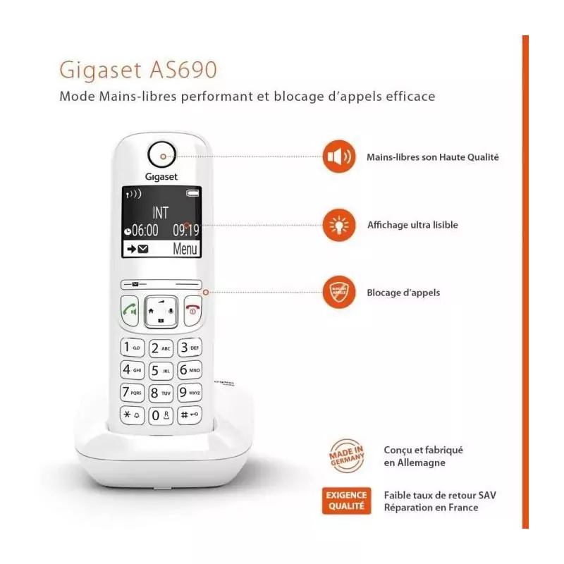 Téléphone Fixe GIGASET AS690 Blanc - Mains-libres performant HSP™ et blocage d'appels efficace